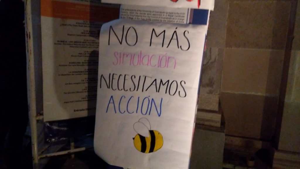 Guanajuato Gto. Estudiantes universitarios se hicieron presentes y respondieron asi a la convocatoria realizada por medio de redes sociales para asistir al exterior del edificio central de la Universidad de Guanajuato, y así exigir seguridad y acciones concretas en materia de seguridad a las autoridades estatales, municipales y de la máxima casa de estudios esto en protesta por la muerte del estudiante Ana Daniela Vega.