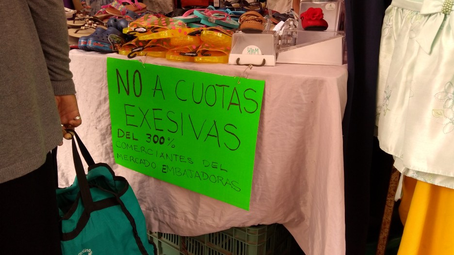 Durante su jornada de este domingo los puestos del tianguis de embajadoras mostraban cartulinas con diversos mensajes al respecto.