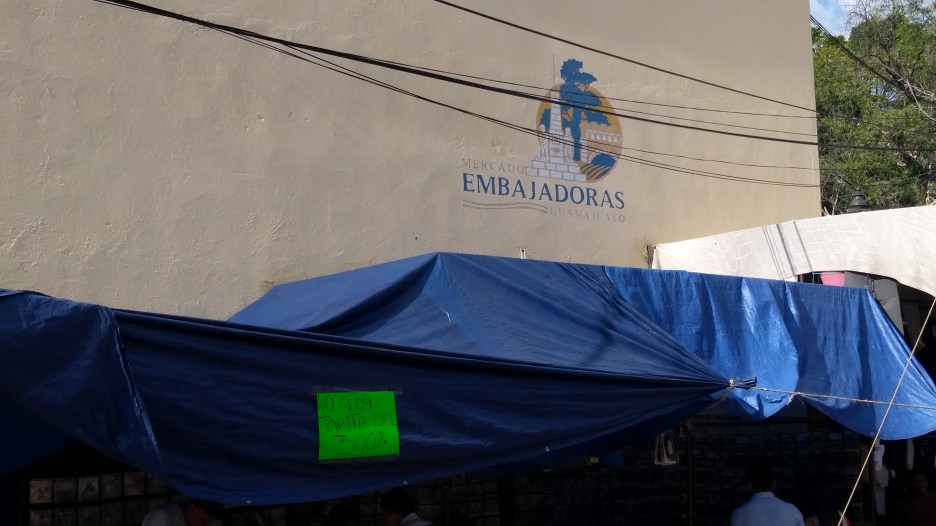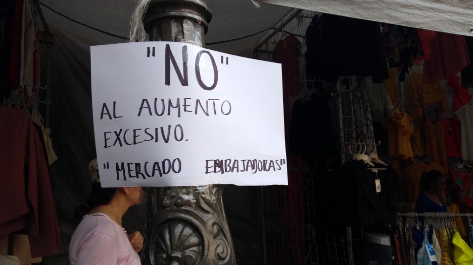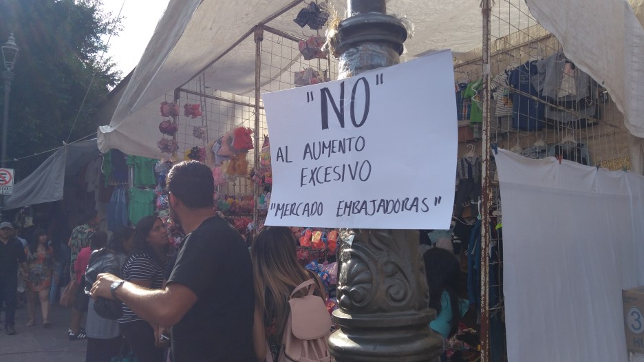 Guanajuato Gto. Comerciantes de varios puestos que forman parte del tianguis que cada domingo se instala en el exterior del mercado embajadoras, mostraron cartulinas en las que se pudo leer consignas en contra del incremento aplicado por el gobierno capitalino a los permisos para comercio fijo y semi fijo.