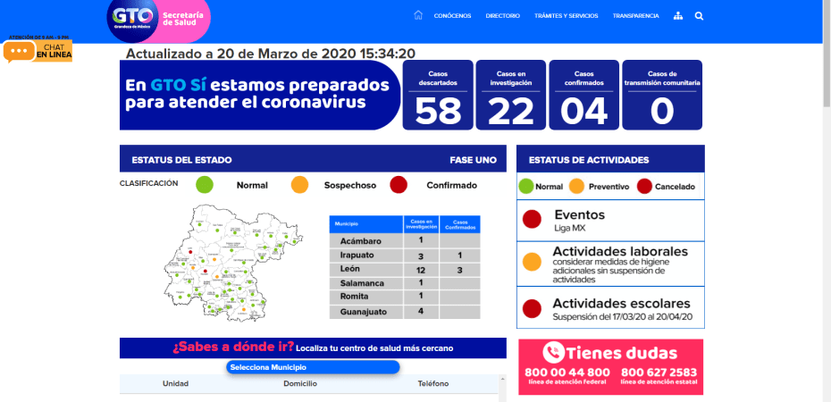 Asimismo, recordó que en el estado hay 16 unidades que se encuentran monitoreando el movimiento que va teniendo este virus en el estado, y las cuales nutren de información la pagina oficial https://coronavirus.guanajuato.gob.mx/ .