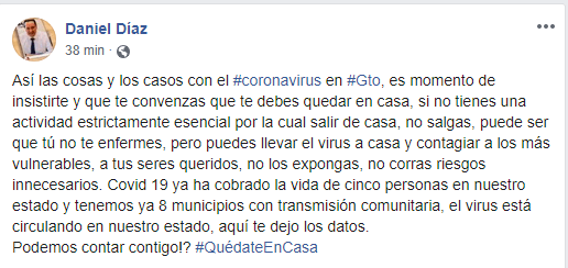 «Así las cosas y los casos con el #coronavirus en #Gto, es momento de insistirte y que te convenzas que te debes quedar en casa, si no tienes una actividad estrictamente esencial por la cual salir de casa, no salgas, puede ser que tú no te enfermes, pero puedes llevar el virus a casa y contagiar a los más vulnerables, a tus seres queridos, no los expongas, no corras riesgos innecesarios. Covid 19 ya ha cobrado la vida de cinco personas en nuestro estado y tenemos ya 8 municipios con transmisión comunitaria, el virus está circulando en nuestro estado, aquí te dejo los datos.