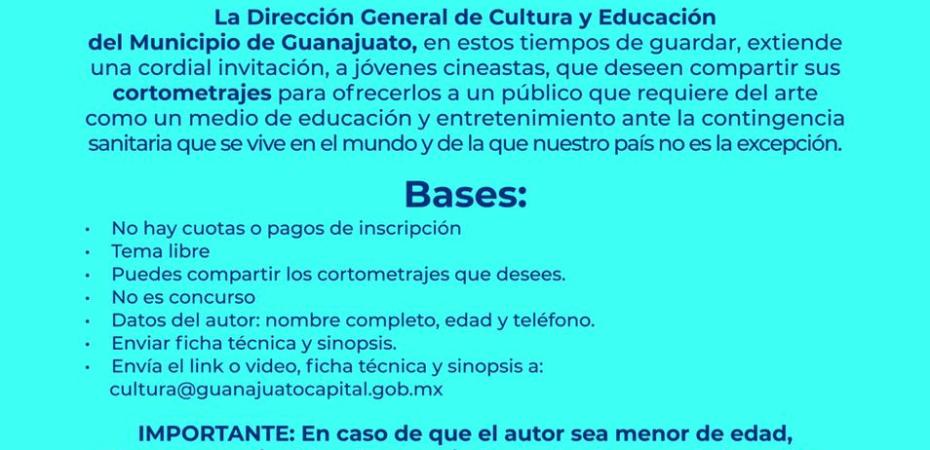 Guanajuato, Gto. Ante la contingencia sanitaria que se vive en todo el país por el coronavirus COVID-19, la Dirección General de Cultura y Educación convocó a las y los jóvenes cineastas a dar muestra de su talento.