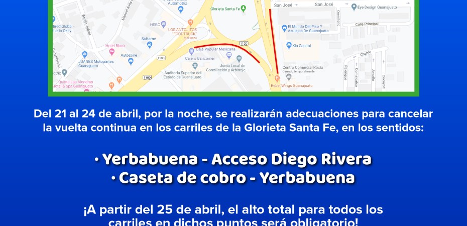 Guanajuato, Gto. Con la finalidad de privilegiar la seguridad de los peatones, desde el domingo 25 de abril quedará suprimida la vuelta continua en los carriles de la Glorieta Santa Fe, de este municipio, así lo informó la Secretaría de Infraestructura, Conectividad y Movilidad (SICOM).