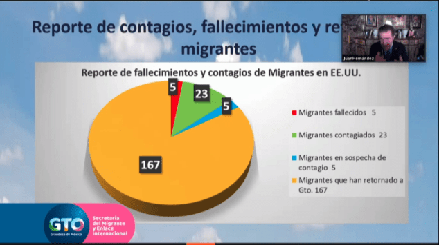 Guanajuato, Gto. El coronavirus sigue cobrando vidas de Migrantes Guanajuatenses, ya que al momento los reportes, de contagios de migrantes son 23, 5 fallecidos y 5 más en sospecha de contagio, así como 167 migrantes que han retornado al Estado de Guanajuato, señaló el Secretario del Migrante y Enlace Internacional,Juan Hernández señaló que de acuerdo a las cifras que le han proporcionado tanto los representantes de las casas club de migrantes en Estados Unidos