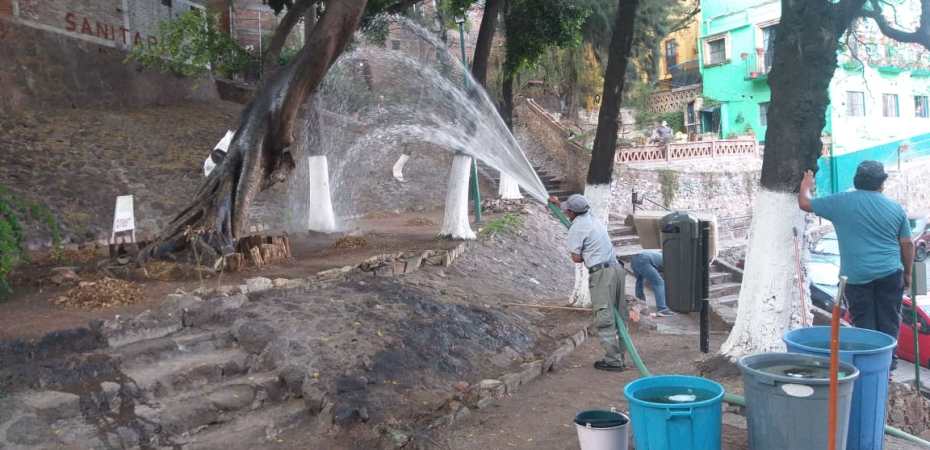 Utilizando una pipa cargada con agua tratada se realizaron trabajos de riego en el lugar y se llenaron contenedores que los mismos vecinos proporcionaron para apoyar durante esta jornada de conservación de una de las zonas más transitadas en el Centro de la ciudad de Guanajuato, que comunica Tepetapa con la glorieta UNESCO, la Plaza Hidalgo y los pastitos.