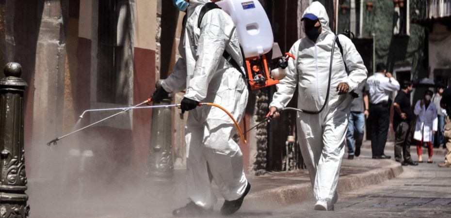 Equipados con aspersoras y trajes protectores, los integrantes de la cuadrilla sanitizante esparcieron una mezcla de hipoclorito y agua para desinfectar planchas de adoquín, banquetas, arroyos viales, jardineras, muros, puentes de cantera y mobiliario urbano, principalmente contenedores, postes y afiles.