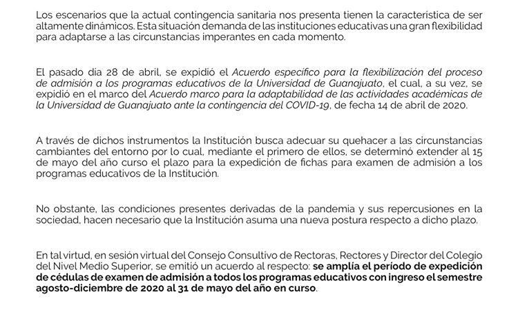 Guanajuato, Gto., En virtud de los escenarios que la actual contingencia sanitaria plantea, el Consejo Consultivo de Rectoras, Rectores y Director del Colegio del Nivel Medio Superior acordó ampliarel período de expedición de cédulas de examen de admisión a todos los programas educativos con ingreso el semestre agosto-diciembre de 2020 al 31 de mayo del año en curso.