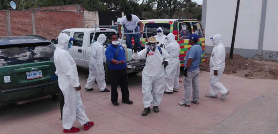 Con la participación de diferentes dependencias se desinfectaron bancas, jardineras, postes, barandales, espacios deportivos y los portones de las casas, trabajo en el que también participaron las y los habitantes de esta comunidad ubicada en el sur del municipio.