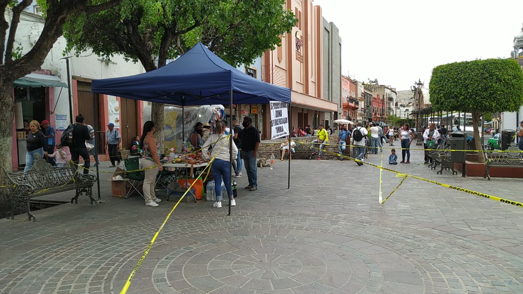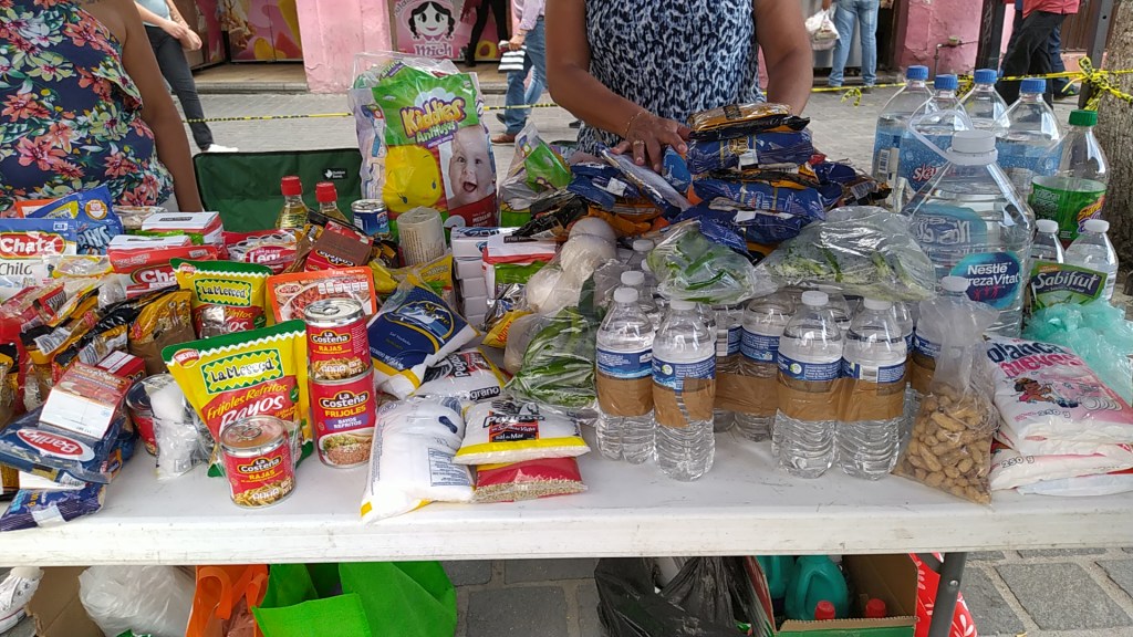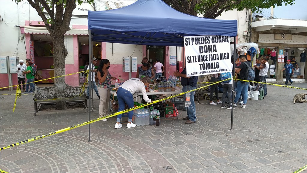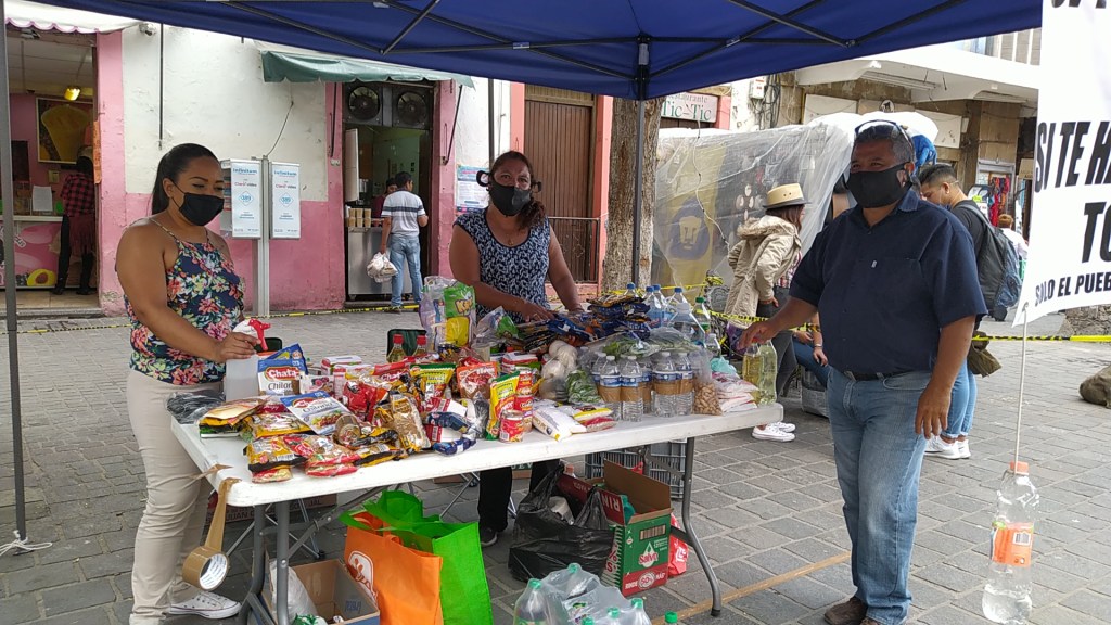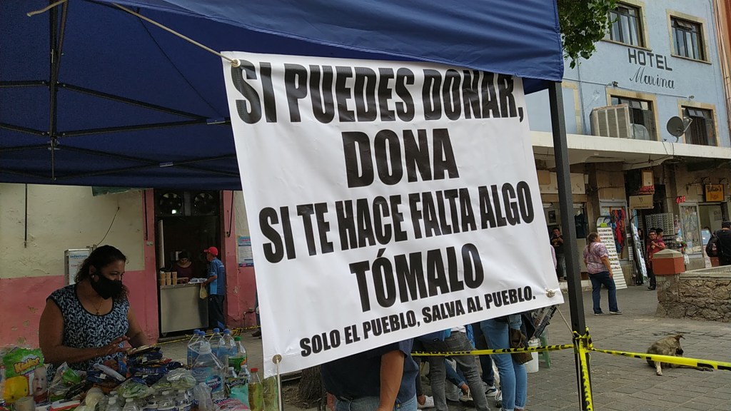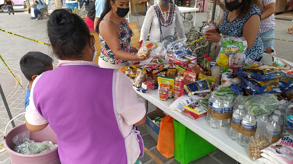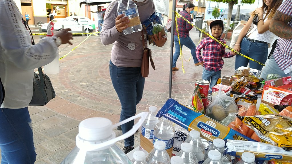 » Empezamos a trabajar nosotros, el colectivo para ver de qué manera apoyamos y ayudamos a la ciudadanía, esto se nos vino a la mente porque como siempre lo he dicho, siempre hay apoyos que está dando el gobierno municipal y la verdad les piden INE, el CURP, comprobante de domicilio, entonces nosotros siempre hemos dado las cosas así cómo ves, ( incluso ) en la lona pusimos, sólo el pueblo salva al pueblo, hay mucha gente que de verdad vino y nos apoyó … Así es, todo el colectivo nos reunimos y pues empezamos a checar qué podemos hacer con la gente que de verdad necesita este apoyo, y pues salió esta iniciativa, aparte tomamos las medidas de sanidad, estuvimos marcando en el suelo también la zona distancia porque pues bien saben que yo trabajo en la salud y esto lo tenemos que hacer así, una entrada, una salida, y cuando se junta la gente la separamos metro medio, para que puedan pasar por su producto»