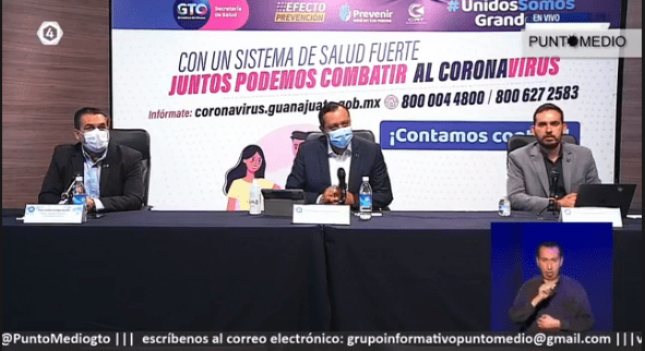 Invitó a la ciiudadanía a mantenerse informada a través del portal coronavirus.guanajuato.gob.mx, o a los teléfonos 800 0044 800 y 800 627 2583. En la rueda de prensa participaron el Coordinador de Comunicación Social, Alan Sahir Márquez Becerra y el Director General Contra Riesgo Sanitarios, Luis Carlos Zúñiga.