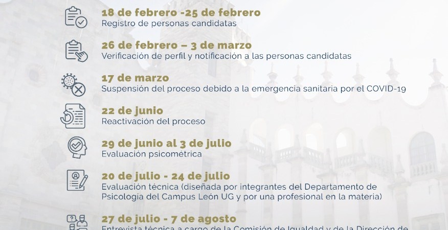 Del 20 al 24 de julio se desarrollarán las evaluaciones técnicas, en las que se contará con el apoyo de especialistas del Departamento de Psicología del Campus León de la UG, además de una persona experta en la materia.