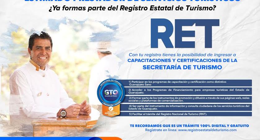 La Secretaría de Turismo de Guanajuato, a través de la Dirección de Información y Análisis, invita a los prestadores de servicios turísticos a tramitar su RET de acuerdo a lo que marca la Ley de Turismo para el estado y sus municipios. Dicha Constancia de inscripción tiene una vigencia de 2 años a partir de su emisión, pudiendo refrendar su registro siempre y cuando se continúe cumpliendo con los requisitos solicitados.