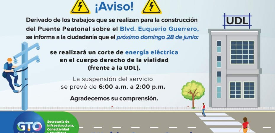 Guanajuato, Gto., Como parte de los trabajos de la construcción del puente peatonal a la altura de la Universidad de León, en el bulevar Euquerio Guerrero, la Secretaría de infraestructura, Conectividad y Movilidad (SICOM), anunció que se realizará un corte de suministro de energía eléctrica durante este próximo domingo 28 de junio.