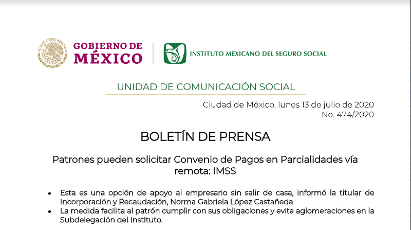 Precisó que este mecanismo no es nuevo, sin embargo ahora es simple “lo que pedimos es que envíen un correo electrónico, con esta información: tarjeta de identificación patronal, la identificación oficial vigente, el acta constitutiva de la persona moral donde aparezcan simplemente los datos esenciales, el poder notarial en caso de tener algún representante legal y un escrito libre donde hagan explícita esta solicitud”.