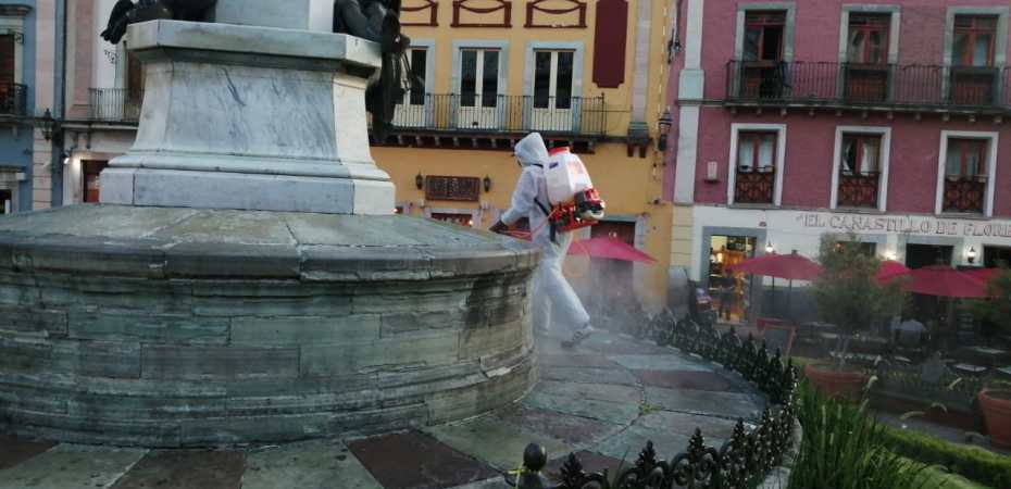 Guanajuato, Gto., Después de la actualización al color naranja del Semáforo Estatal para la Reactivación Económica, trabajadores de la Presidencia Municipal de Guanajuato realizaron una jornada de sanitización en las plazas y plazuelas del centro histórico.