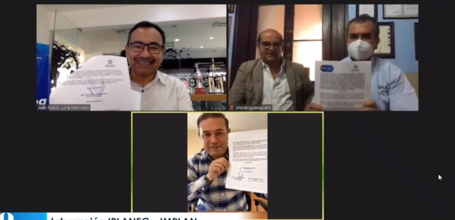 Guanajuato, Gto., – El Instituto Municipal de Planeación (IMPLAN) y el Instituto de Planeación, Estadística y Geografía del Estado de Guanajuato (IPLANEG) establecieron un convenio de colaboración para el intercambio de información encaminado a un mejor diseño de políticas públicas y a tener una sociedad mejor informada. El convenio fue firmado por el Presidente Municipal de Guanajuato, Alejandro Navarro Saldaña y por los titulares del IPLANEG y del IMPLAN, Juan Pablo Luna Mercado y Ramón González Flores, respectivamente. El Alcalde Navarro refrendó su disposición de trabajo con Gobierno del Estado y resaltó la colaboración histórica que ha habido entre el IMPLAN e IPLANEG como parte del trabajo conjunto de estas dos instituciones. «Coincidimos en que la gente tenga más rápido la información y la mejor información para la toma de decisiones y sin duda el IPLANEG y en nuestro caso el IMPLAN creo que están haciendo el trabajo y lo están haciendo muy bien”, agregó Navarro Saldaña. El Director General del IPLANEG detalló que con este convenio se conformará un comité municipal de información y estadística, se unificarán los criterios para el intercambio de información a través de una plataforma tecnológica única y se realizará un congreso anual para la profesionalización de los servidores públicos con especialistas y ponentes a nivel nacional e internacional. Luna Mercado reconoció la apertura del gobierno de Navarro Saldaña y al IMPLAN para el trabajo conjunto en materia de información y estadística. En la ceremonia de firma de convenio, que se realizó de manera virtual, estuvo presente el Presidente de la Junta Directiva del IMPLAN, Manuel Stein Velasco.