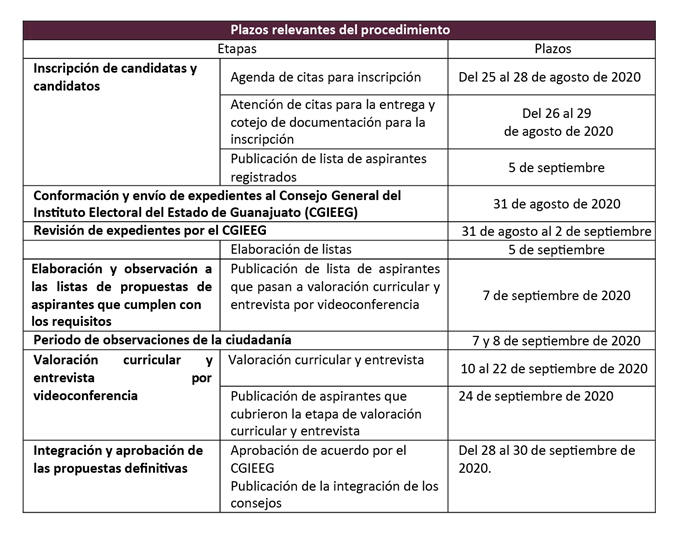 El procedimiento para la integración de los consejos electorales constará de las etapas y plazos siguientes: