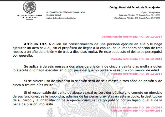 Con la iniciativa presentada por Prieto Gallardo, se busca incrementar esta pena a máximo 10 años de cárcel, y actualmente se castiga este delito con pena de 3 meses a 3 años de cárcel, en el actual código penal del estado de Guanajuato.