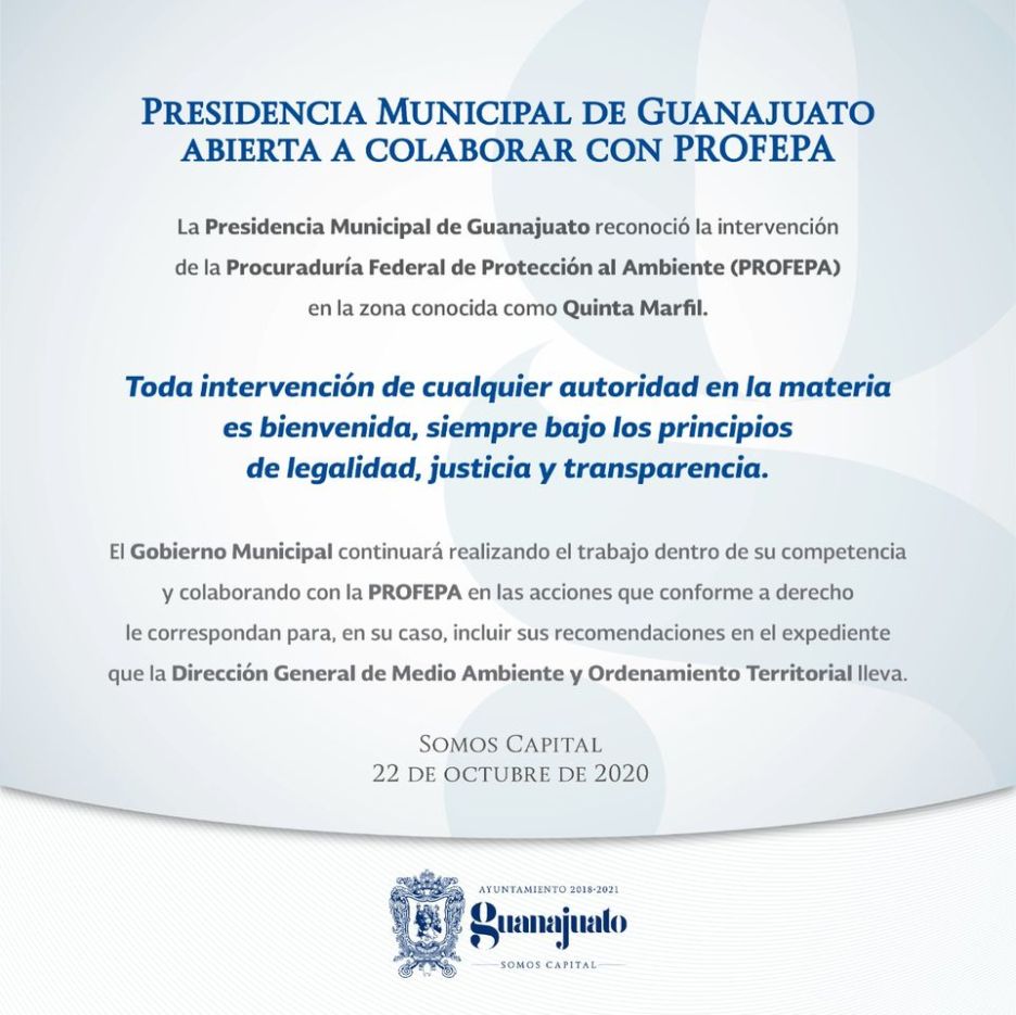 Guanajuato, Gto., 22 de octubre de 2020.- La Presidencia Municipal de Guanajuato reconoció la intervención de la Procuraduría Federal de Protección al Ambiente (PROFEPA) en la zona conocida como Quinta Marfil.