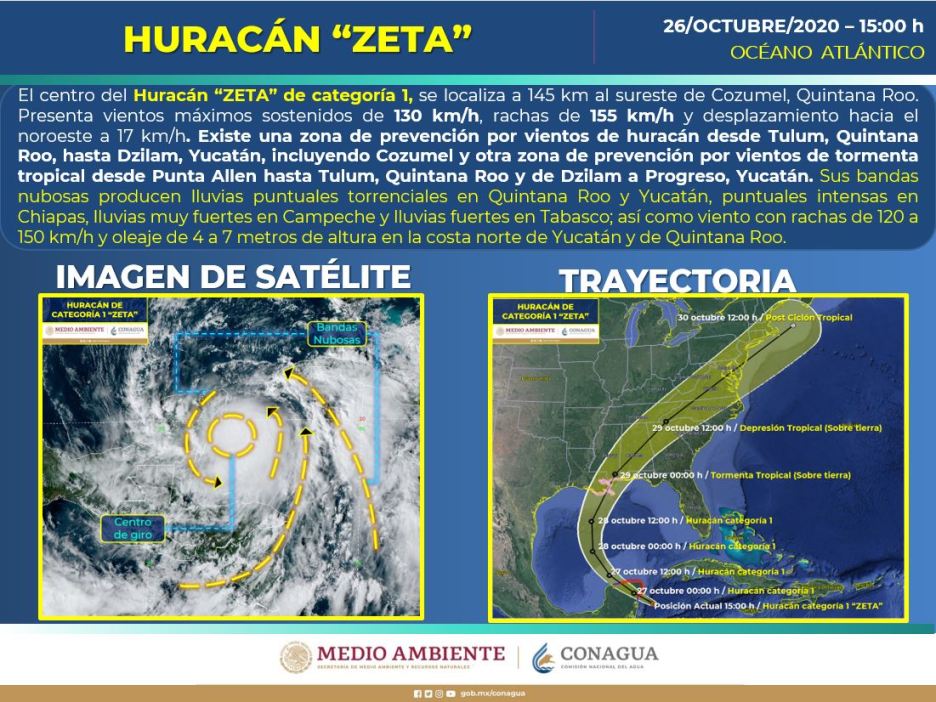 Laura Velázquez Alzúa, titular de la CNPC, informó que ante la presencia inminente del huracán de categoría 1, identificado como “Zeta”, “las autoridades de los tres órdenes de gobierno trabajamos de manera coordinada para atender a las personas que se ubican en Quintana Roo, Yucatán y Tabasco”.