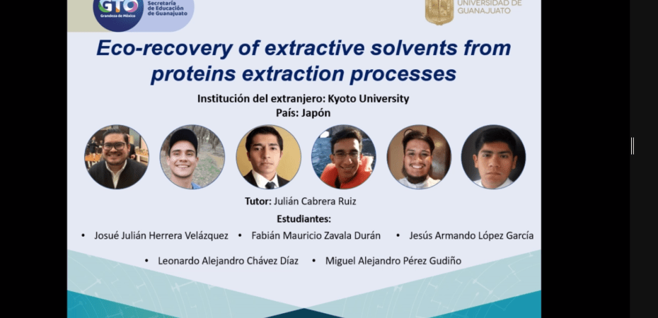 El proyecto “Eco-recovery of extractive solvents from proteins extraction processes” ganador en la categoría de “Energías limpias y sustentabilidad”, fuedesarrollado por estudiantes de la Licenciatura en Ingeniería Química: Josué Julián Herrera Velázquez, Fabián Mauricio Zavala Durán, Jesús Armando López García, Leonardo Alejandro Chávez Díaz y Miguel Alejandro Pérez Gudiño, quienes tuvieron como tutor al Dr. Julián Cabrera Ruiz, profesor del Departamento de Ingeniería en Química de la Universidad de Guanajuato (UG).