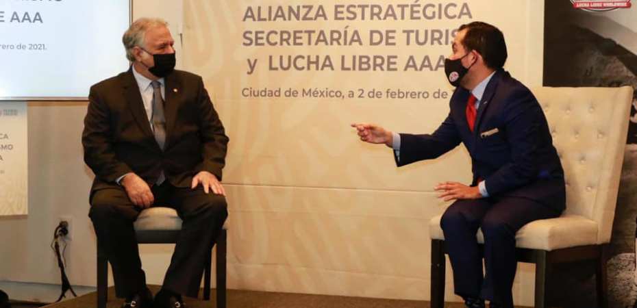 El secretario de Turismo del Gobierno de México, Miguel Torruco Marqués, firmó una alianza estratégica con Dorian Roldán Peña, director general de Lucha Libre AAA Worldwide, que tendrá el objetivo de promover distintos destinos turísticos del país.