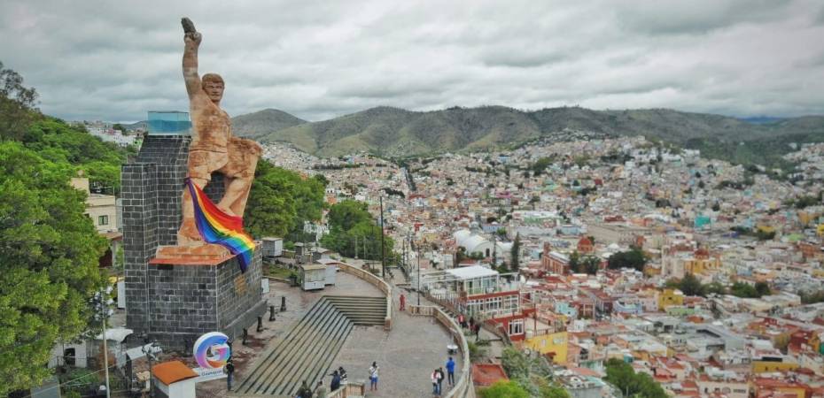 Guanajuato, Gto., .- Por primera vez en la historia de la ciudad de Guanajuato como un mensaje de respeto hacia la diversidad de todas las personas de México y el mundo ondeó la bandera arcoíris en la mega escultura del Pípila . Para conmemorar el Día Internacional del Orgullo LGTB, la Presidencia Municipal que encabeza Alejandro Navarro Saldaña, colocó una súper bandera de colores en el monumento que se puede ver desde prácticamente cualquier punto del Centro Histórico de esta Ciudad Patrimonio Cultural de la Humanidad. «Guanajuato Capital es por su historia y esencia una tierra de libertad, diversidad, respeto y valentía para luchar por los derechos individuales y la igualdad», aseguró Alejandro Navarro quien reiteró que todas y todos son bienvenidos en la Capital Cervantina de América. Desde los primeros minutos del 28 de junio comenzó a ondear la bandera de franjas de colores sobre el monumento de cantera rosa de 26 metros de altura que corona la ciudad en lo alto del Cerro de San Miguel. El gobierno municipal también colocó corazones arcoiris a lo largo de la zona peatonal del Centro Histórico y banderas de colores en distintos puntos de la ciudad.