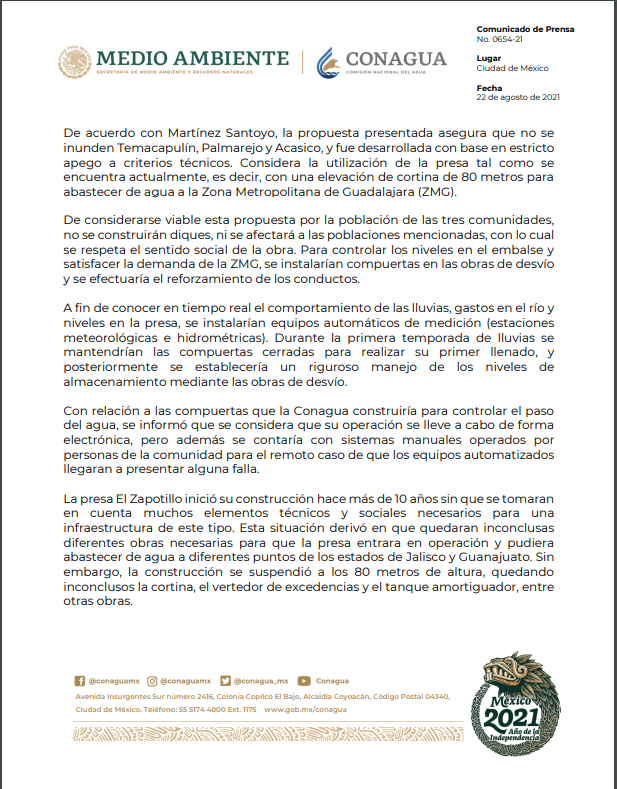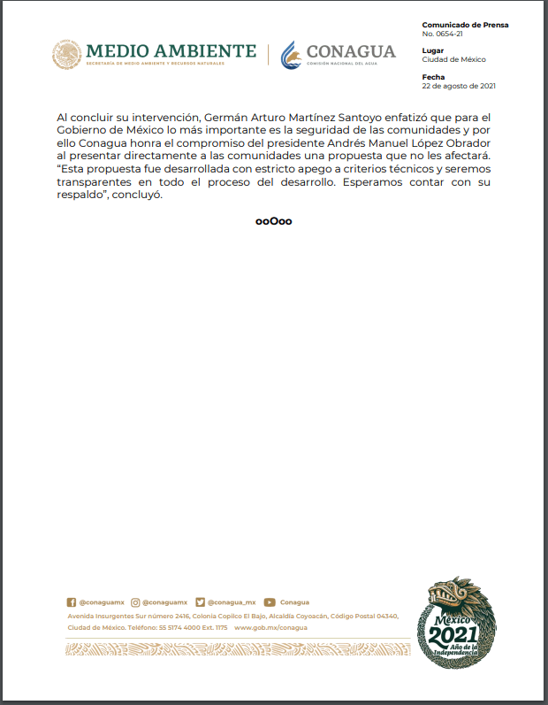 Al concluir su intervención, Germán Arturo Martínez Santoyo enfatizó que para el Gobierno de México lo más importante es la seguridad de las comunidades y por ello Conagua honra el compromiso del presidente Andrés Manuel López Obrador al presentar directamente a las comunidades una propuesta que no les afectará. “Esta propuesta fue desarrollada con estricto apego a criterios técnicos y seremos transparentes en todo el proceso del desarrollo. Esperamos contar con su respaldo”, concluyó.
