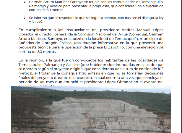Guanajuato, Gto. En cumplimiento a las instrucciones del presidente Andrés Manuel López Obrador, el director general de la Comisión Nacional del Agua (Conagua), Germán Arturo Martínez Santoyo, encabezó en la localidad de Temacapulín, municipio de Cañadas de Obregón, Jalisco, una reunión informativa en la que presentó una propuesta técnica para la operación de la presa El Zapotillo, con una elevación de cortina de 80 metros.