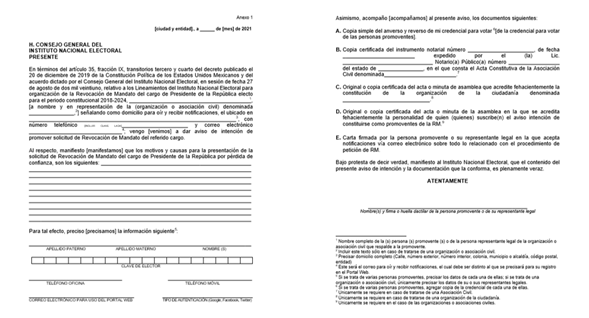 Junto con el aviso de intención en original con firma autógrafa de la persona promovente o representante legal, se deberá proporcionar: una cuenta de correo electrónico, así como el tipo de cuenta de usuario para autenticarse a través de Google, Facebook o Twitter, fundamental para el acceso a la Aplicación Móvil (APP) para recabar las firmas de apoyo de la ciudadanía, copia simple del anverso y reverso de la credencial para votar y carta firmada de la persona promovente o su representante legal en la que acepta notificaciones vía correo electrónico, sobre todo lo relacionado con el procedimiento de petición.