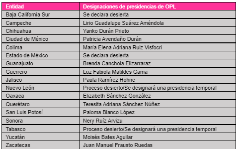 | Entidad | Designaciones de presidencias de OPL |