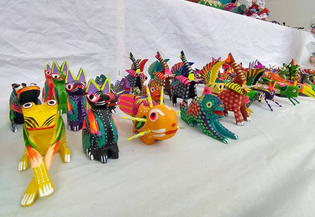 Los alebrijes se hacen con madera de copal. Son maravillas oaxaqueñas. A la madera se le da forma cuando está verde y se le aplica un barniz especial para que no sea carcomida por los insectos. Una vez que se tiene la figura tallada, se resana y se pule para pasar a la fase del decorado con decenas de colores brillantes que, literal, hacen vibrar a la pieza.