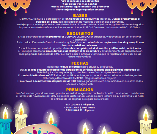 Esta será la primera edición del concurso organizado por el SIMAPAG, en el cual los participantes deberán promover con sus calaveritas el tema del uso correcto y cuidado del agua, además de ser graciosas, y ocurrentes sin ser ofensivas u obscenas.